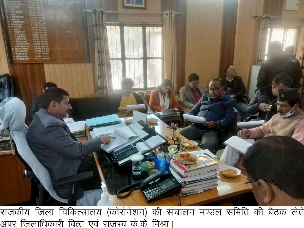 देहरादून दिनांक 14 फरवरी 2023, (जि.सू.का), जिलाधिकारी श्रीमती सोनिका के निर्देशों के अनुपालन में अपर जिलाधिकारी वित्त एवं राजस्व के.के मिश्रा ने अपने कार्यालय कक्ष में चिकित्सा प्रबंधन समिति राजकीय जिला चिकित्सालय (कोरोनेशन) की संचालन मण्डल समिति की बैठक ली।