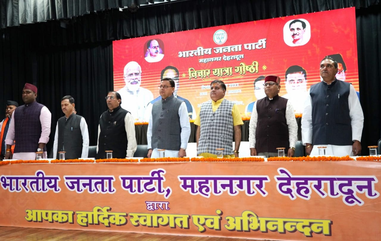 सर्वे चौक स्थित आई.आर.डी.टी. सभागार में भाजपा द्वारा आयोजित विचार यात्रा संगोष्ठी में सांसद श्री नरेश बंसल, भाजपा अध्यक्ष श्री महेन्द्र भट्ट, विधायक श्री खजान दास आदि ने भी सम्बोधित कर मुख्यमंत्री श्री पुष्कर सिंह धामी को युवा मुख्यमंत्री के रूप में उनके द्वारा राज्य हित में लिये जा रहे निर्णयों की जमकर सराहना की। उन्होंने मुख्यमंत्री के कार्यों को अन्य राज्यों के लिये भी प्रेरणादायी बताया। मुख्यमंत्री ने इस अवसर पर 101 बुजुर्ग कार्यकर्ताओं को स्मृति चिन्ह देकर सम्मानित किया तथा उनका आर्शीवाद लिया।