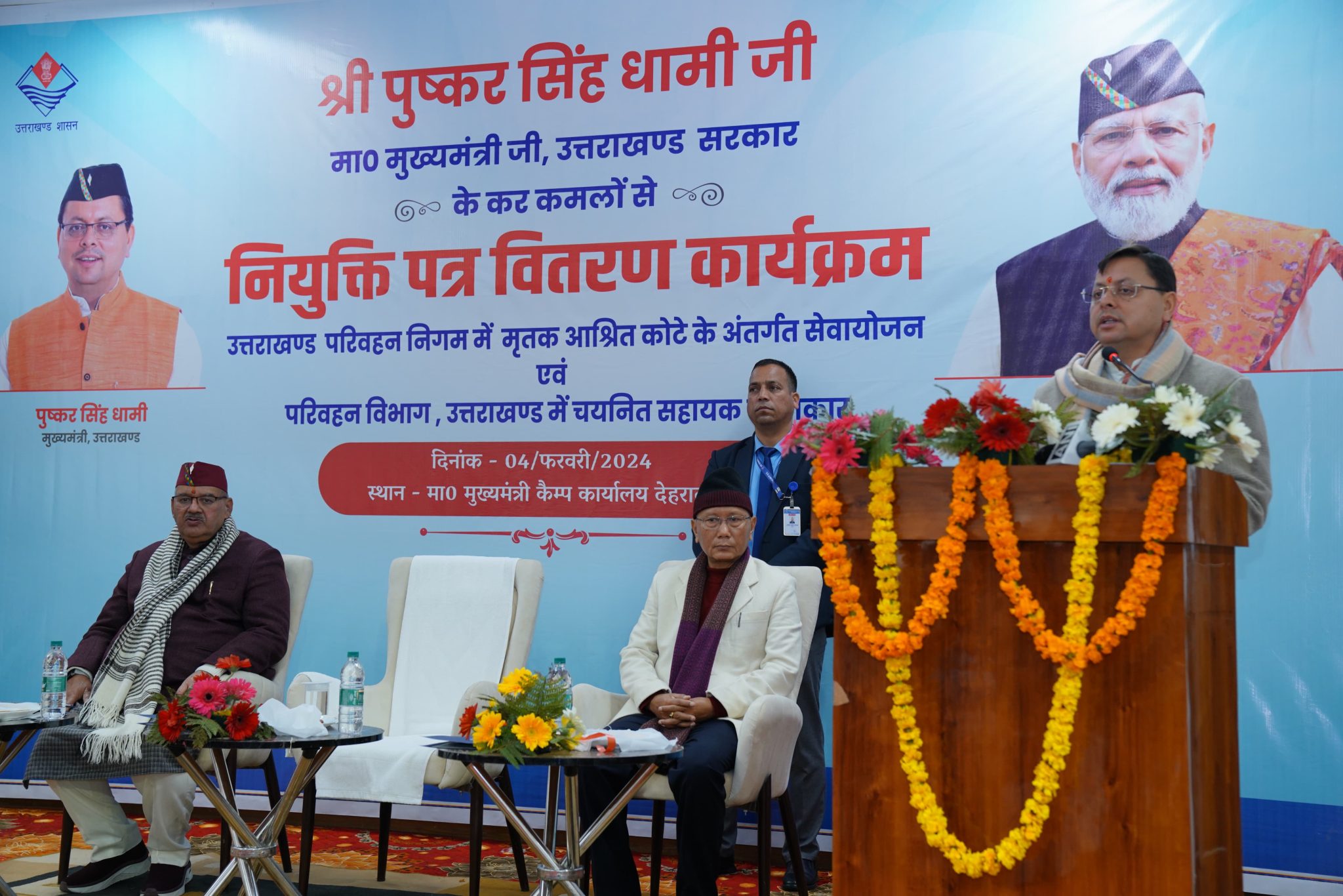 मुख्यमंत्री ने परिवहन विभाग और परिवहन निगम के 122 अभ्यर्थियों को प्रदान किये नियुक्ति पत्र। राज्य स्तरीय सड़क सुरक्षा जनजागरूकता रैली का फ्लैग ऑफ किया। 16 महिलाओं को निःशुल्क प्रशिक्षण के बाद प्रदान किये ड्राइविंग लाइसेंस। सड़क सुरक्षा कैलेण्डर और सड़क सुरक्षा पर आधारित डाटा बुक का मुख्यमंत्री ने किया विमोचन। मुख्यमंत्री श्री पुष्कर सिंह धामी ने मुख्यमंत्री कैम्प कार्यालय स्थित मुख्य सेवक सदन में परिवहन निगम के अन्तर्गत चालक एवं परिचालक पद के लिए 106 अभ्यर्थियों को नियुक्ति पत्र प्रदान किये। इन अभ्यर्थियों को मृतक आश्रित के रूप में परिवहन विभाग में नियुक्ति दी गई है। परिवहन विभाग के अन्तर्गत चयनित 16 सहायक लेखाकारों को भी मुख्यमंत्री ने नियुक्ति पत्र प्रदान किये। इस अवसर पर मुख्यमंत्री ने सड़क सुरक्षा माह के अन्तर्गत राज्य स्तरीय सड़क सुरक्षा जनजागरूकता रैली का फ्लैग ऑफ किया। इस अभियान के तहत सभी जनपदों में सड़क सुरक्षा के प्रति जनजागरूकता कार्यक्रम आयोजित किये जायेंगे। कार्यक्रम के दौरान उन्होंने सड़क सुरक्षा कैलेण्डर और सड़क सुरक्षा पर आधारित डाटा बुक का विमोचन भी किया। 16 महिलाओं को परिवहन विभाग द्वारा निःशुल्क ड्राइविंग प्रशिक्षण देने के बाद मुख्यमंत्री ने उन्हें ड्राइविंग लाइसेंस भी प्रदान किये। मुख्यमंत्री ने नियुक्ति पत्र प्राप्त करने पर परिवहन निगम और परिवहन विभाग के सभी अभ्यर्थियों को शुभकामनाएं देते हुए कहा कि अपनी नौकरी की शुरूआत से ही अपने कर्तव्यों का ईमानदारी, सच्ची लगन और कड़ी मेहनत से निर्वहन करें। परिवहन सेवा को सुचारू रखने के लिए चालक और परिचालक का महत्वपूर्ण दायित्व होता है। उन्होंने कहा कि सरकारी सेवा में आत्म अनुशासन का होना बहुत जरूरी है। उन्होंने कहा कि नौकरी की शुरुआती चरण से ही अपनी नियमित दिनचर्या के साथ कार्य करना शुरू करेंगे, तो यही दिनचर्या आदत में शामिल हो जायेगी। मुख्यमंत्री ने कहा कि राज्य में श्रद्धालुओं और पर्यटकों की संख्या में तेजी से वृद्धि हो रही है। इनकी सुखसुविधाओं को और बेहतर बनाने की भी परिवहन विभाग और परिवहन निगम पर बड़ी जिम्मेदारी है। इस दशक को उत्तराखण्ड का दशक बनाने के लिए हम सबको अपनेअपने क्षेत्रों में अहम योगदान देना है, सबके सहयोग से उत्तराखण्ड को देश के अग्रणी राज्यों की श्रेणी में लाने के लिए राज्य सरकार कृत संकल्प के साथ कार्य कर रही है। मुख्यमंत्री ने कहा कि राज्य के युवाओं को रोजगार और स्वरोजगार से जोड़ने के लिए सरकार द्वारा लगातार प्रयास किये जा रहे हैं। लोक सेवा आयोग और अधीनस्थ सेवा चयन आयोग के माध्यम से अनेक भर्ती प्रक्रियाएं गतिमान हैं। पिछले दो सालों में तेजी से भर्ती प्रक्रियाएं पू
