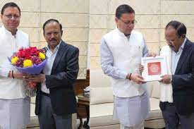 उत्तराखंड के मुख्यमंत्री पुष्कर सिंह धामी ने शनिवार को राष्ट्रीय सुरक्षा सलाहकार अजीत डोभाल से भेंट की. अपने दिल्ली प्रवास के दूसरे दिन मुख्यमंत्री ने डोभाल से उनके आवास पर मुलाकात की. आधिकारिक सूत्रों ने बताया कि यह एक सामान्य मुलाकात थी और इस मुलाकात के दौरान विभिन्न विषयों पर चर्चा की गयी.