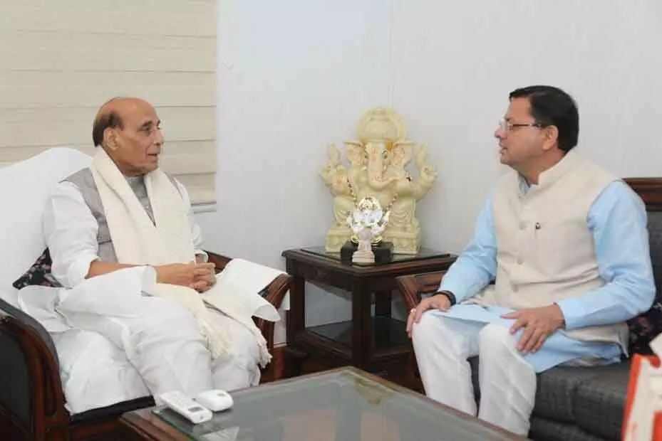 मुख्यमंत्री पुष्कर सिंह धामी ने रविवार को नई दिल्ली में केंद्रीय रक्षा मंत्री राजनाथ सिंह से मुलाक़ात की। इस दौरान मुख्यमंत्री ने केंद्रीय मंत्री से एयर फोर्स ऑडिट ब्रांच देहरादून में ही यथावत रहने देने और ग्वालदम–नंदकेसरी–थराली–देवाल–मुन्दोली–वाण मोटर मार्ग के रख-रखाव का कार्य लोक निर्माण विभाग से ही कराए जाने का अनुरोध किया।