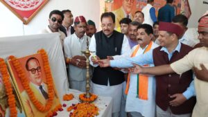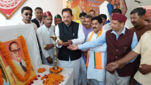 कुसुम खेड़ा नंदा बैंकट हॉल में आज केंद्रीय रक्षा एवं पर्यटन राज्य मंत्री अजय भट्ट ने सविधान के निर्माता भारत रत्न डॉ भीमराव अम्बेडकर की जयंती में आयोजित कार्यक्रम में मुख्य अतिथि के रूप में प्रतिभाग किया। इस दौरान उन्होंने डॉ भीमराव अम्बेडकर के चित्र पर पुष्प गुच्छ अर्पित करे । उन्होंने बताया कि आज पूरा देश उनकी 132 वी जयंती मना रहा है। डॉ भीमराव अंबेडकर ने देश के संविधान का निर्माण किया, और कई किताबें लिखी है, आज प्रधानमंत्री मोदी जी ने उनके नाम को और आगे बढ़ाने का कार्य किया है।