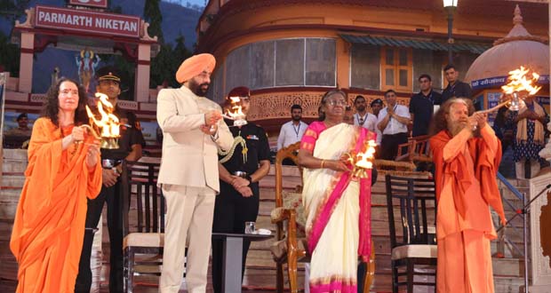 राष्ट्रपति द्रौपदी मुर्मू और उत्तराखंड के राज्यपाल लेफ्टिनेंट जनरल गुरमीत सिंह (सेनि.) परमार्थ निकेतन आश्रम पहुंचे। आश्रम परिसर में शंख ध्वनि, पुष्पवर्षा और वेदमंत्रों से उनका स्वागत हुआ। आश्रम परिसर में स्वामी चिदानंद सरस्वती की साधना स्थली में विराजित मां लक्ष्मी की प्रतिमा को पुष्पहार अर्पित कर राष्ट्रपति ने शक्ति के प्रति श्रद्धा और भक्ति समर्पित किया।