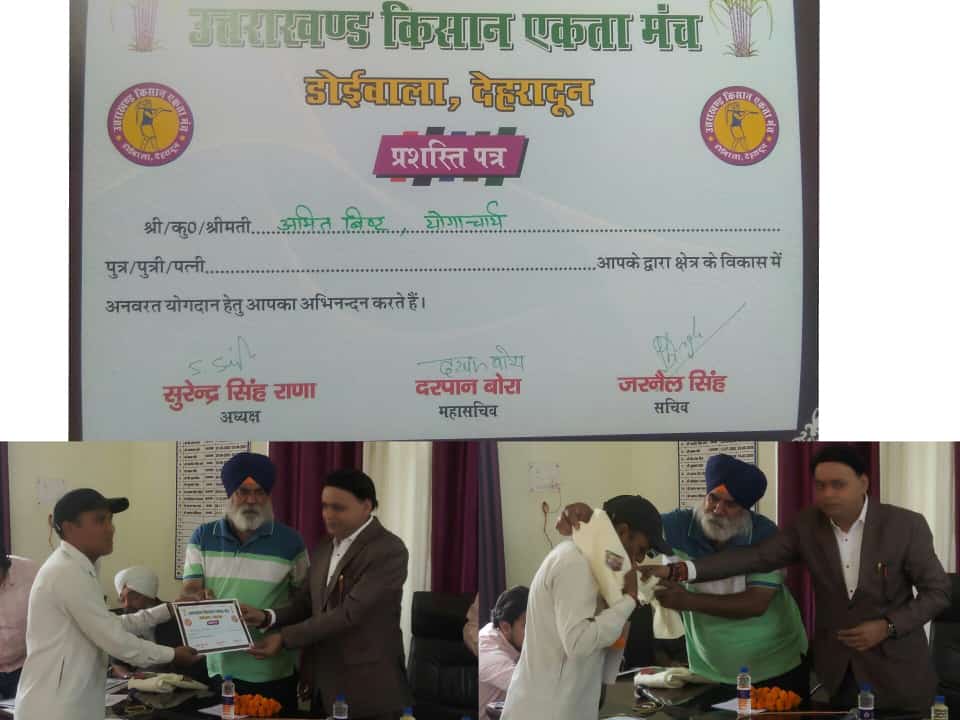 आज राज्य किसान एकता मंच के अध्यक्ष सरदार सुरेंद्र सिंह राणा जी मंच के महासचिव दरपान बोरा जी सचिव जरनैल सिंह उपाध्यक्ष प्रेम सिंह पांचाल जी संरक्षक उदय पाल जी कमल अरोड़ा जी तरसेम सिंह जी विक्रम सिंह जी एवं किसान एकता मंच के सभी सदस्य द्वारा विशेष सम्मान समारोह का आयोजन किया गया जिसमें विभिन्न क्षेत्रों में सराहनीय कार्य करने वाले सभी सामाजिक कार्यकर्ताओं को प्रशसित पत्र दिया गया जिसमें मुख्य अतिथि के तौर पर दिनेश प्रताप सिंह अधिशासी निदेशक शुगर मिल, सरदार गुरदीप सिंह जी गुरुद्वारा प्रबंधक कमेटीके प्रधान ,सरदार तजेंद्र सिंह जी, सूबेदार सुरेश पुंडीर जी,सरदार बलवीर सिंह जी के द्वारा सभी सामाजिक कार्यकर्ताओं को प्रशिक्षित पत्र से सम्मान किया गया जिसमे योग के क्षेत्र में अमित बिष्ट जी को रंनजोध जी को कोरोना काल में गरीबों की सहायता करने पर हरविंदर सिंह जी को गरीब बच्चों को स्वरोजगार एवं कंप्यूटर की शिक्षा देने के लिए , पत्रकारिता के क्षेत्र में नवल किशोर यादव जी को राजकुमार अग्रवाल जी को ज्योति यादव जी प्रशिक्षित पत्र दिया गया रफल लोधी जी को किसानी क्षेत्र में इसी तरह कई सामाजिक कार्यकर्ताओं को किसान एकता मंच द्वारा सम्मान दिया गया रफल लोधी जी द्वारा किसान एकता मंच को ₹21000 का अनुदान दिया गया
